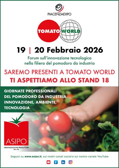 ASIPO SAC partecipa a Tomato World 2026, evento dedicato all’innovazione tecnologica nella filiera del pomodoro da industria, in programma il 19 e 20 febbraio 2026 a Piacenza.