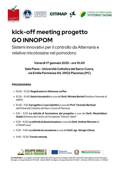 Venerdì 17 gennaio 2025, ore 10:00 presso la Sala Piana – Università Cattolica del Sacro Cuore in Via Emilia Parmense 84 a Piacenza sarà presentato il progetto “GO INNOPOM “- Sistemi innovativi per valutare e contrastare lo sviluppo di Alternaria e altre micotossine del pomodoro da industria. Il progetto è realizzato nell’ambito del Programma strategico della PAC 2023-2027 della Regione Emilia-Romagna.