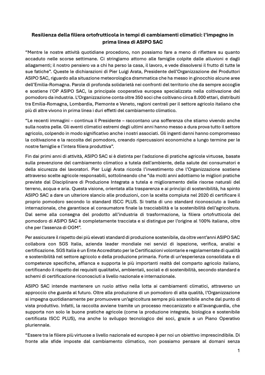 Negli anni, ASIPO SAC ha consolidato un sistema integrato di certificazioni, superando con successo audit rigorosi e adottando pratiche virtuose in diversi ambiti. Il premio ne conferma la visione strategica, che punta a mantenere la competitività del pomodoro italiano attraverso investimenti mirati e scelte lungimiranti.